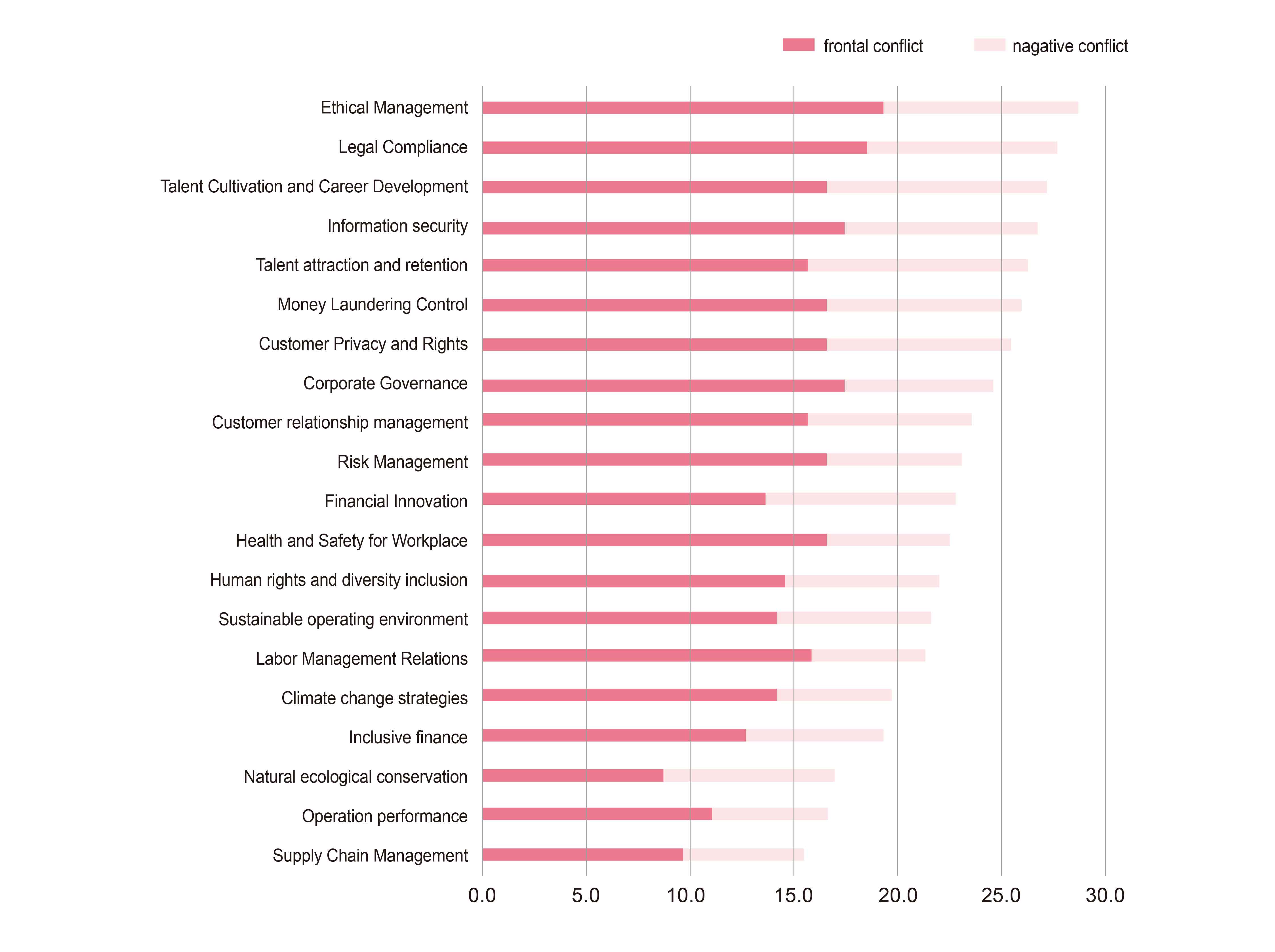 Distribute external questionnaires to survey stakeholders' level of concern regarding sustainability issues. After defining the key issues, senior executives of the Bank were invited to assess the positive and negative impacts of 21 sustainability issues on the economy, environment, and people (human rights). The evaluation results were ranked as shown in the following chart, with the impact levels arranged from highest to lowest. -