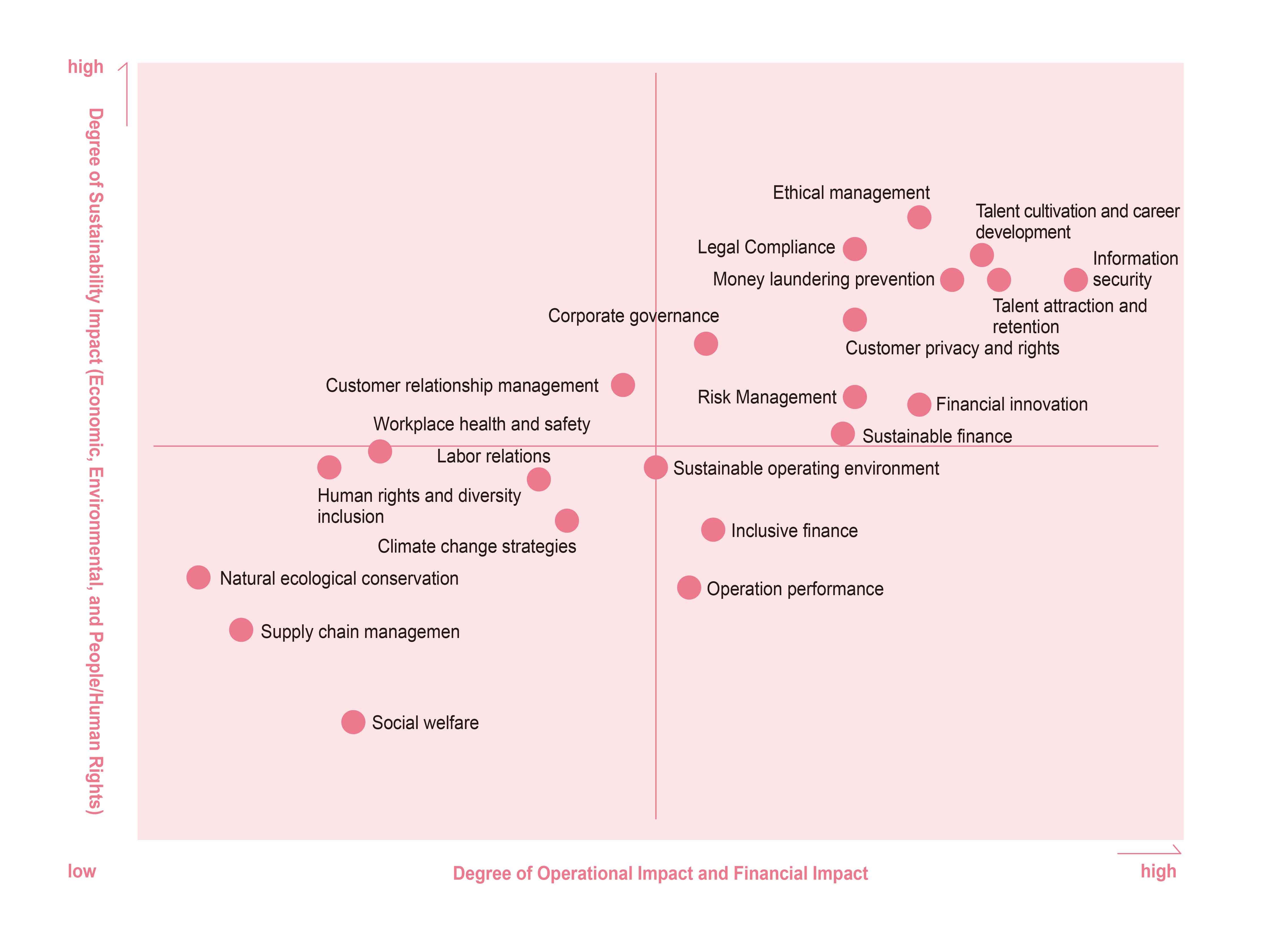 Through the Assessment of Financial Materiality Questionnaire, senior executives of the Bank were asked to assist in evaluating the financial materiality of sustainability issues (i.e., the impact on the company's operations and degree of financial impact). By integrating the "Sustainability Impact Level" and the "Operational and Financial Impact Level," a dual materiality matrix was produced to identify topics with dual materiality that have significant impacts on both the company's financial operations and external influences. According to the analysis results, there are a total of 11 topics with dual materiality.