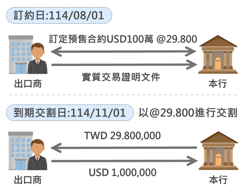 客戶以約定匯率29.800向本行賣出美金100萬,買入新台幣29,800,000,以鎖定匯率成本。