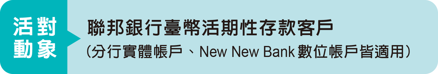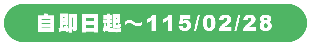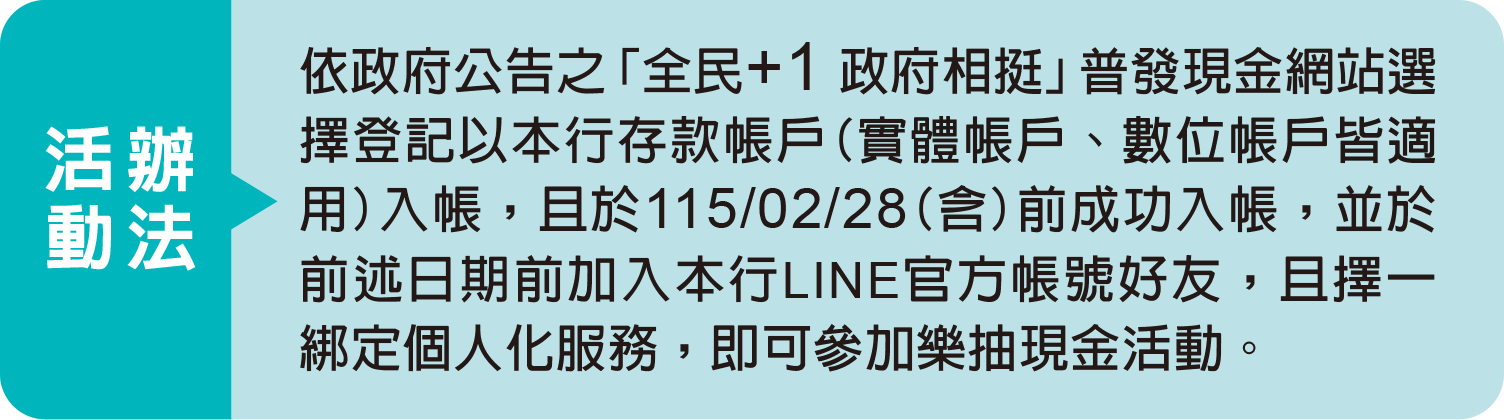 | 3. | 「全民+1 政府相挺,普發1萬現金」入帳時間,須在115/02/28 PM23:59前入帳本行存款帳戶始符合活動辦法。 |