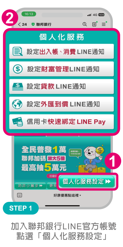 | 4. | 抽獎資格說明:本活動採隨機抽獎,申請以本行臺幣活期性存款帳戶登記入帳(實體帳戶、New New Bank數位帳戶皆適用),且成功入帳並完成擇一綁定個人化服務者,每筆成功入帳享一次抽獎機會,每人最高享五次抽獎機會(相關代領規定,係依政府公告辦法為準),得獎名單將於115/03/31公佈於本行官網,中獎者帳戶回饋金將於115/04/30(含)前完成回饋入帳。若於本行檢核回饋資格或發送回饋時,中獎者已辦理結清銷戶或其他本行依「聯邦商業銀行新臺幣存款約定書」及「聯邦商業銀行線上開立數位綜合存款帳戶約定書」暫時停止、終止實體帳戶或數位帳戶業務關係,則本行保留取消或修改中獎名單之權利。 |