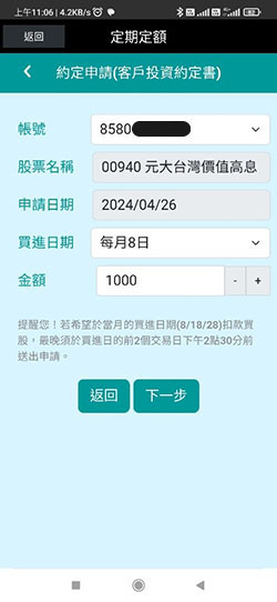 | 2. | 定期定額約定金額如低於買進股票最小單位(1股)之成本,則會取消此筆交易(例如約定聯發科,但約定金額是1000元)。 |