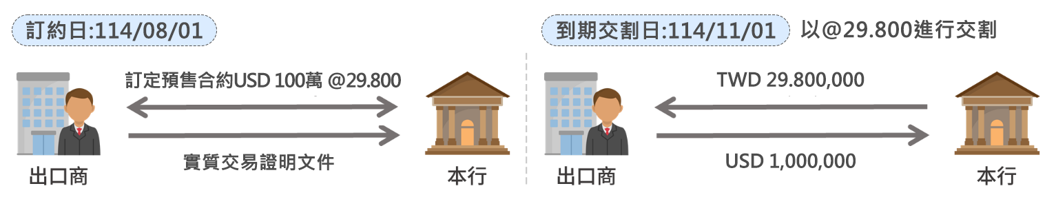 出口商三個月後有美金100萬貨款收入,因預期未來美元將貶值(新台幣升值), 則可與本行訂定預售美元遠期外匯交易。